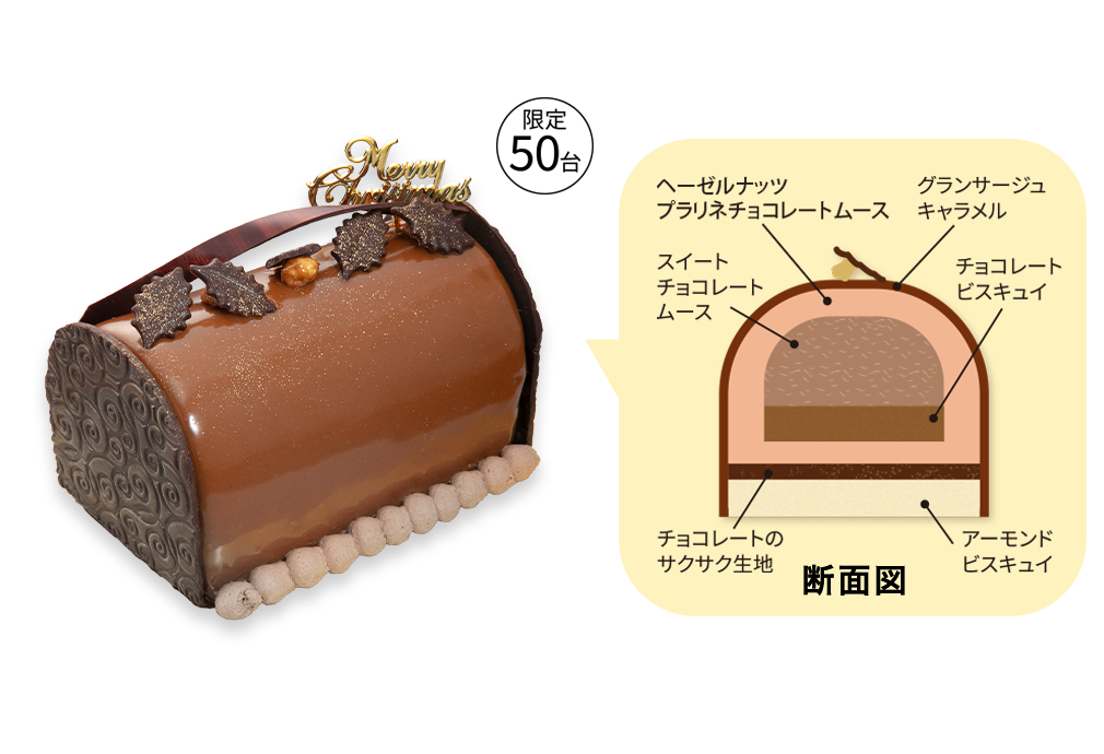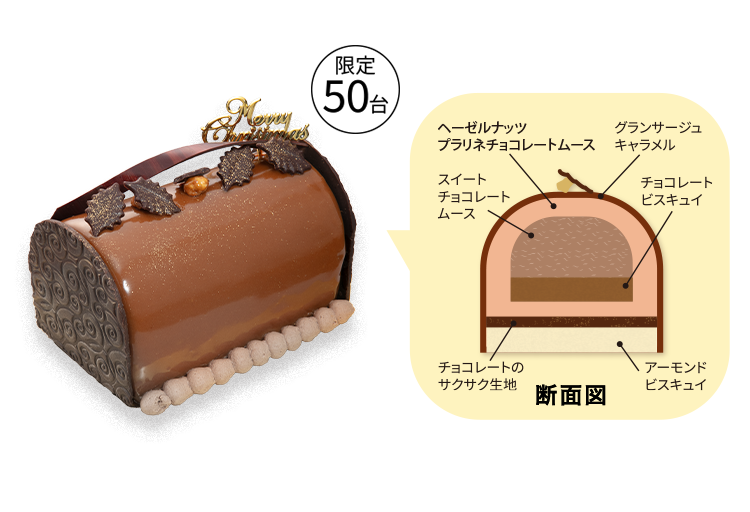 今年のブッシュドノエルはヘーゼルナッツプラリネをアクセントにしたチョコレートケーキでございます。