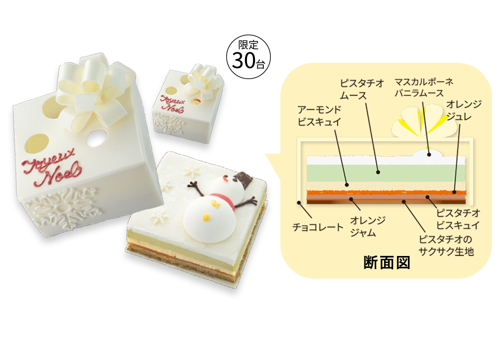 ピスタチオとバニラのムースにオレンジジュレとジャムをバランスよく組み合わせました。