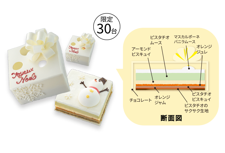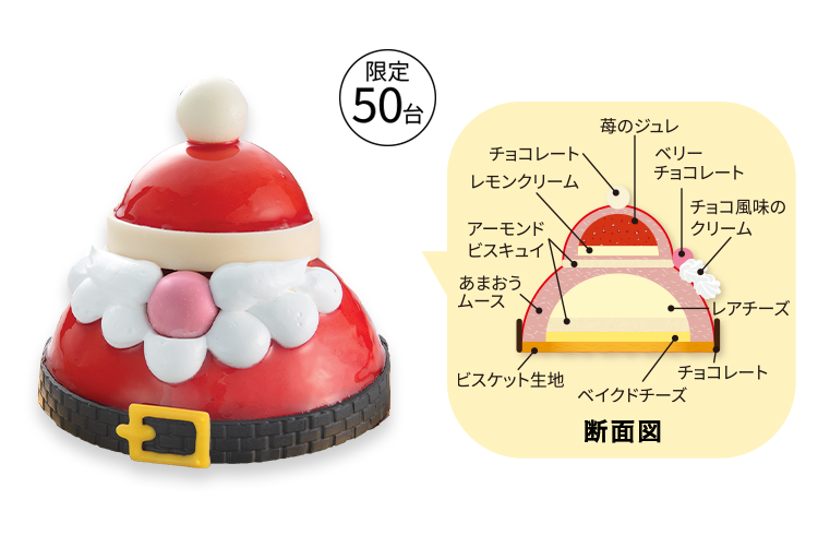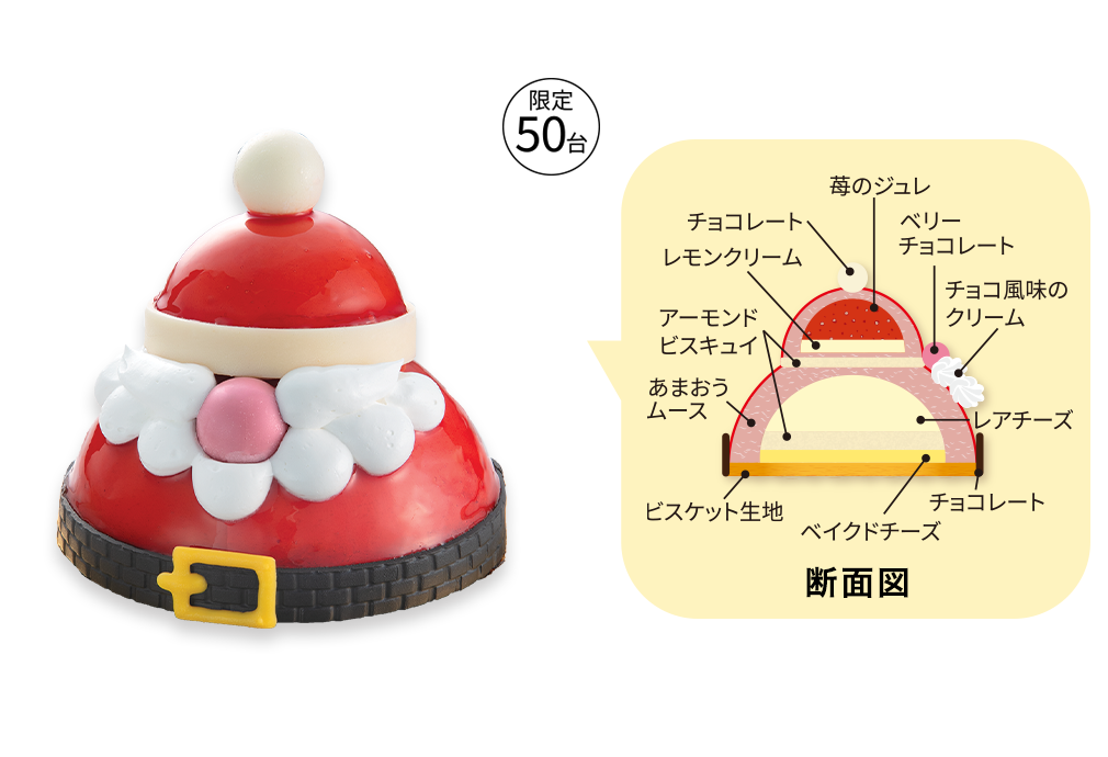 二層のチーズケーキとミックスベリーのジュレ、あまおうムースと組み合わせた可愛いサンタさんのケーキです。
